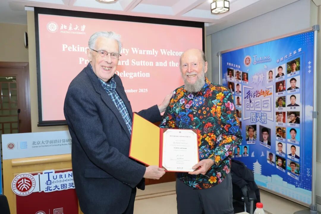 活动伊始,北京大学客座讲席教授、前沿计算研究中心主任 John Hopcroft 教授代表北京大学图灵班,邀请 Richard Sutton 教授担任“北京大学图灵导师”,期待他未来指导和助力图灵班学生的成长与发展,并现场为其颁发荣誉证书。