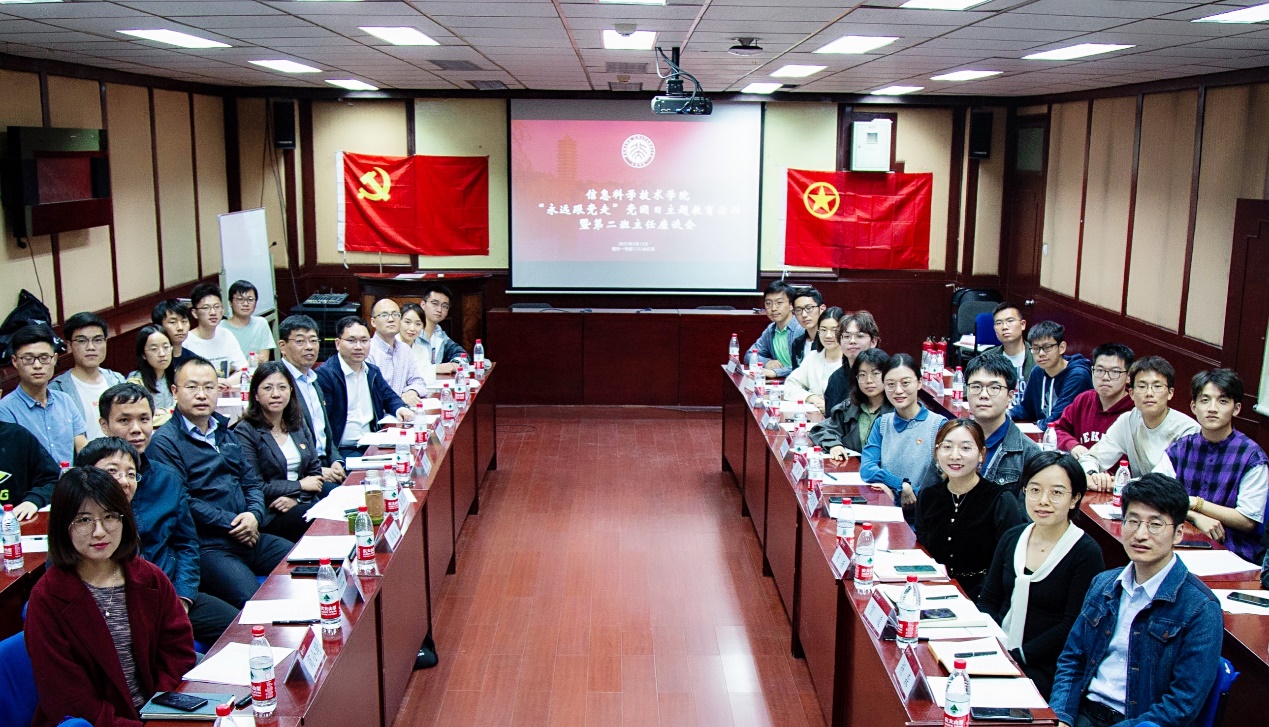 为深入学习贯彻习近平总书记在党史学习教育动员大会上的重要讲话精神,聚焦国家关于信息科学技术的战略部署,弘扬新工科校园文化,引导信科广大师生坚定“永远跟党走”的理想信念,5月15日晚,信息科学技术学院隆重举办“永远跟党走”党团日主题教育活动暨第二班主任座谈会。北京大学党委常委、副校长,信息与工程学部主任,信科2019级本科9班第二班主任黄如,北京大学人事部部长、心理与认知科学学院院长,信科2019级本科10班第二班主任方方(视频连线参加会议),北京大学党委组织部党校办公室副主任,信科2019级本科8班第二班主任张魁元,北京大学人事部人事调配办公室副主任,信科2020级本科8班第二班主任项燕,北京大学学生就业指导服务中心副主任,信科2020级本科2班第二班主任魏朋,学院党委书记魏中鹏以及班主任和辅导员代表、学生代表参加了本次会议。会议由学院党委副书记熊校良主持。