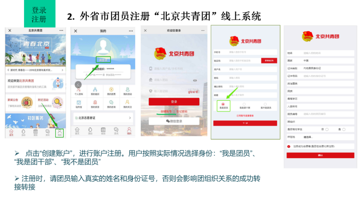 进入系统后,参照下图流程进行注册。身份请选择“我是团员;对于“团组织”一项的填写,参考京内同学操作流程第4-6项。特别的,请务必确认姓名、身份证号填写无误且与其他地区线上系统信息一致;对于2017年及之后入团的团员,还请务必确认团员编号(应为12位)填写无误且与其他地区线上系统信息一致。