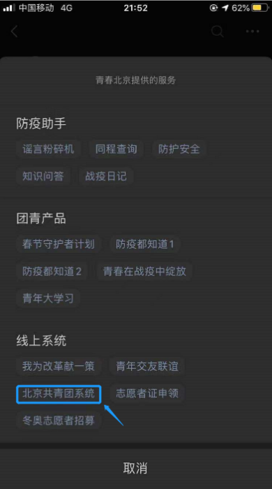 请在微信内搜索“青春北京”公众号(或扫描下方二维码),在下方服务栏中选择线上系统→北京共青团系统。