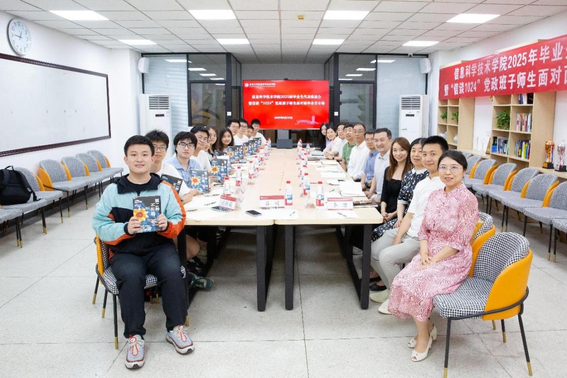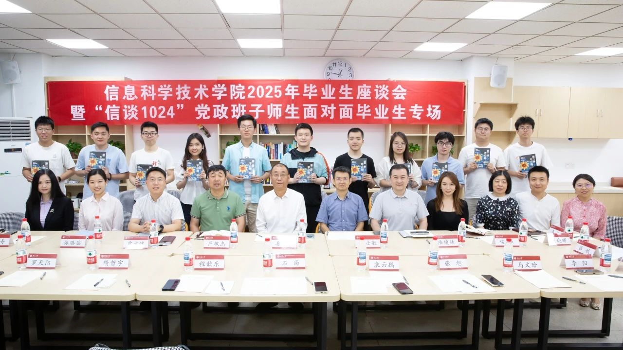 2025年6月25日中午,北京大学信息科学技术学院于理科一号楼1127会议室举办2025届毕业生代表座谈会暨“信谈1024”党政班子师生面对面毕业生专场活动。校党委副书记、学院2021级4班第二班主任姜国华,党办校办机要室主任、学院2021级4班第二班主任张璐瑶,党办校办年鉴与统计办公室主任、学院2021级6班第二班主任侯乐受邀与毕业生代表亲切交流。信科学院党委书记严敏杰、院长侯士敏、副院长陆俊林、党委副书记贾方健和教务办主任董晓晖、学工办主任李子奇等学院领导老师参会。活动由学院团委书记、毕业年级辅导员吕媛主持。