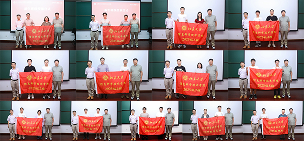 严敏杰和侯士敏向2025级各班班主任、辅导员及新生代表授予班旗。鼓励各班团结奋进、砥砺前行。
