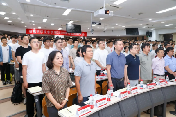 8月19日晚,北京大学信息科学技术学院2025级新生迎新大会在理科教学楼108教室举行。学院党委书记严敏杰,院长侯士敏,副院长陆俊林、王润声、邓斌,党委副书记贾方 健,校友吴连龙,学院教务办主任董晓晖,副主任李享和张霞、刘祯,学生工作办公室主任李子奇、团委书记吕媛,学院辅导员胡籽萱、马武斌、石璧君,2025级各班的班主任和带班辅导员,老生代表以及2025级全体新生参加大会。会议由学院2025级年级辅导员梁怿主持。