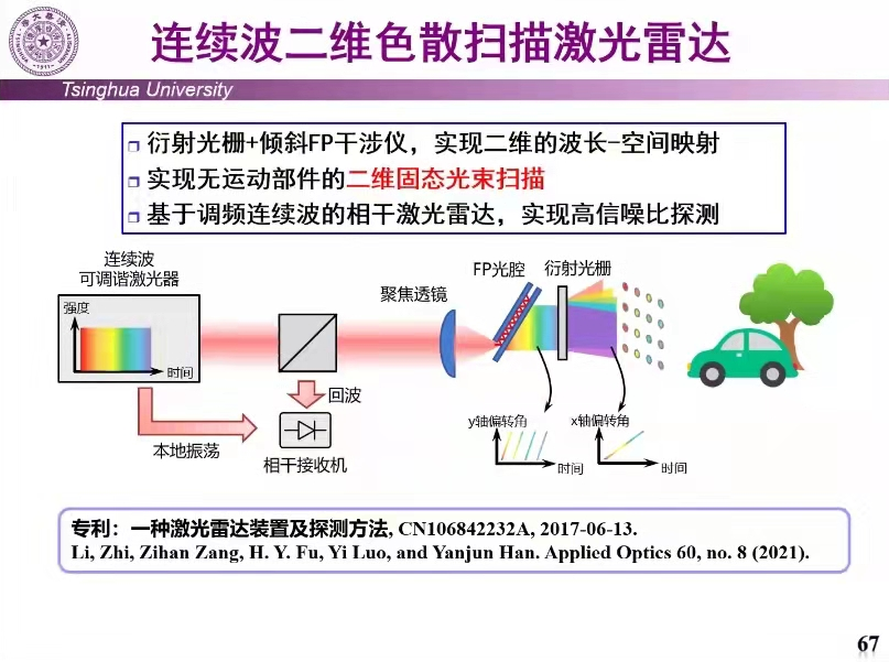 最后,针对光波波动性(相位承载信息)的技术特质及其在基于衍射光栅波束调控的激光雷达方面的应用,罗毅院士介绍了波动光学、空间色散等,而后介绍了连续波二维色散扫描激光雷达,实现高信噪比探测。
