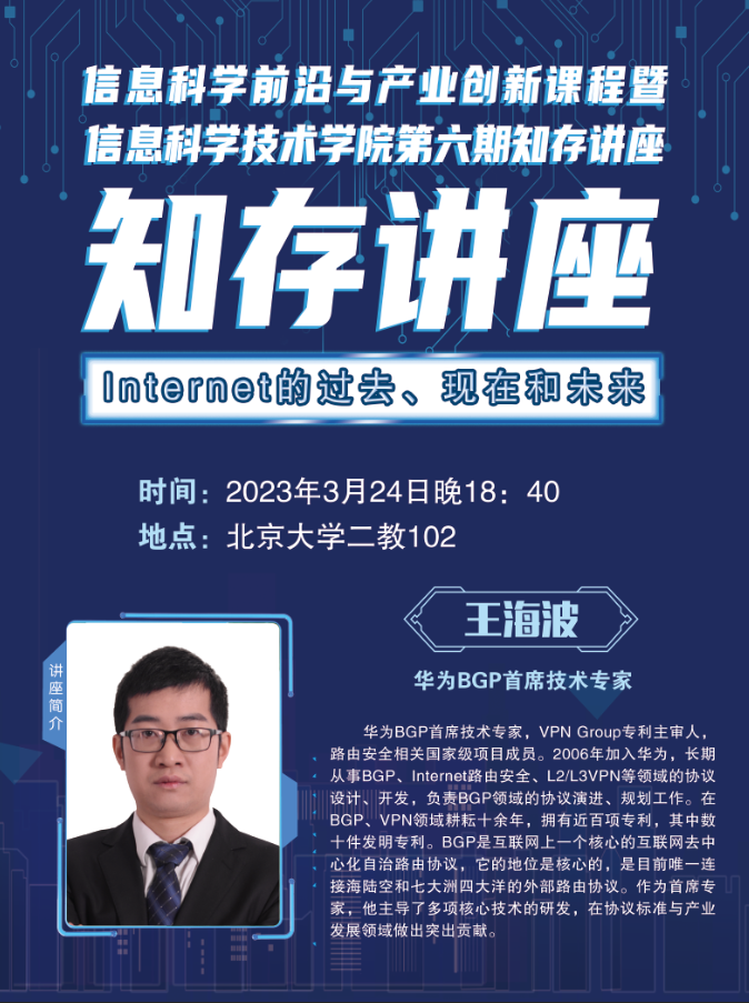 2022年3月24日,北京大学信息科学技术学院第六期“知存讲座”暨信息科学前沿与产业创新课程在北京大学二教102教室成功举办。来自华为数据通信产品线的BGP首席技术专家王海波先生受邀开展了“Internet的过去,现在与未来”的讲座。他在数据通信相关协议领域耕耘多年,同时也是VPN专利主审人、路由安全相关国家级项目成员。本次讲座由北大息科学技术学院副院长王润声主持,学院团委副书记乔冠一和众多学子共同参与。