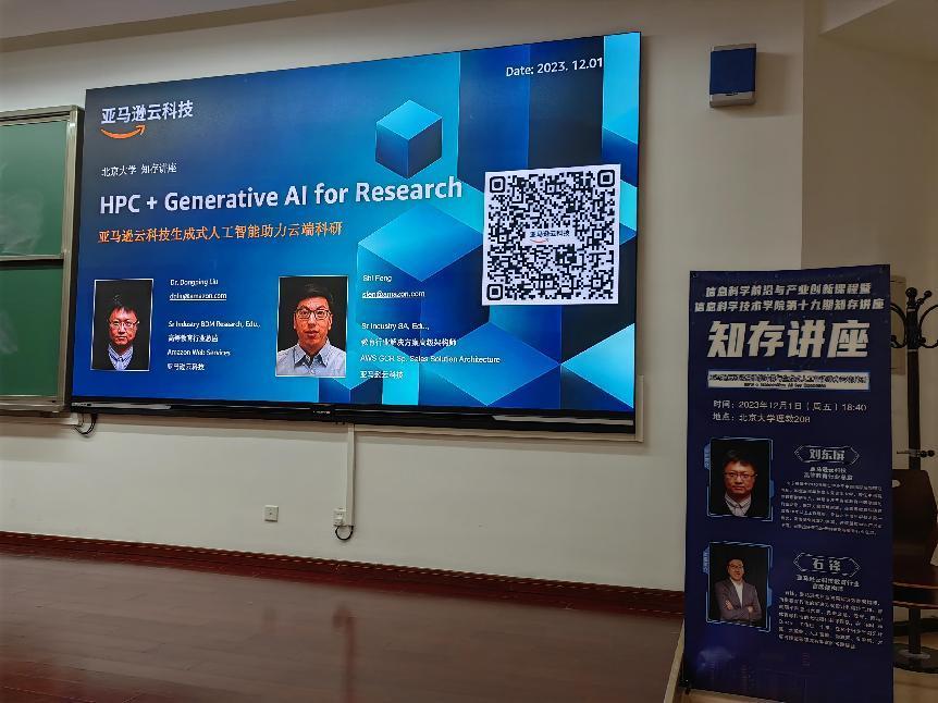 2023年12月1日晚,信息科学技术学院第十九期“知存讲座”暨信息科学前沿与产业创新课程在北京大学理科教学楼208教室顺利举办。曾任中科院物理研究所副研究员,现任亚马逊云科技高等教育行业总监的刘东屏教授和亚马逊云科技资深解决方案架构师石锋老师受邀进行了以“亚马逊云科技生成式人工智能(GenAI)助力云端科研”为主题的分享,400余名师生到场聆听;信息科学技术学院副院长王润声教授主持了本次活动;亚马逊云科技的朱耀飞、乔敬霄、李亦钊等现场支持本次活动,并参与了学生问题的解答。