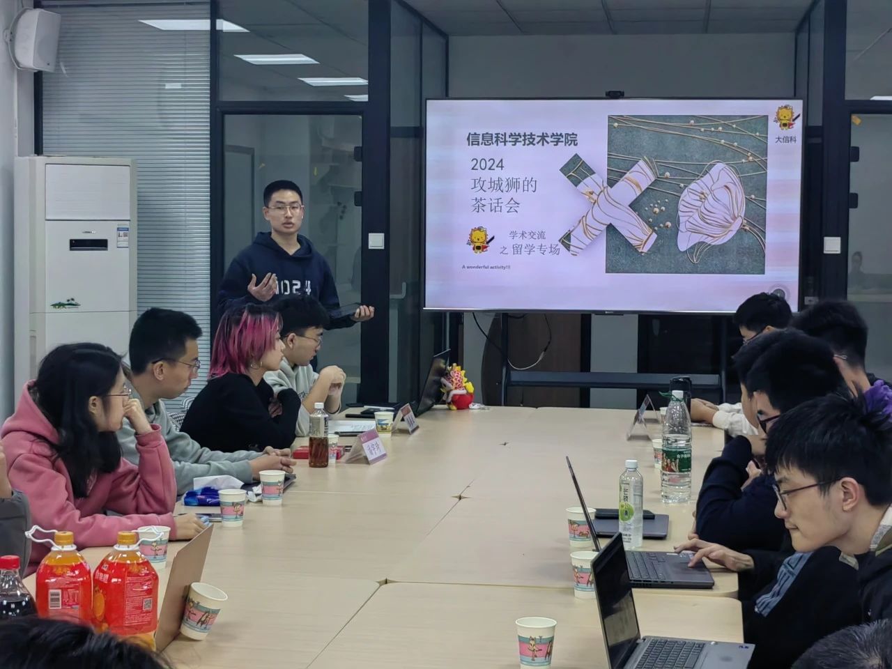 2024年3月24日上午,“攻城狮的茶话会—学术交流留学专场”活动于理科一号楼1127室成功举办。计算机科学与技术专业2020级本科生、以机器学习和经济学交叉领域为研究方向、即将前往CMU读Phd的张嘉豪同学,信息与计算科学专业2020级本科生、以计算经济学为研究方向的潘宇琦同学等两名分享同学和一名专业留学指导教师与15名信科学院同学共同参与本次活动。信息科学技术学院学生会学术部吴宇轩同学主持本次活动。