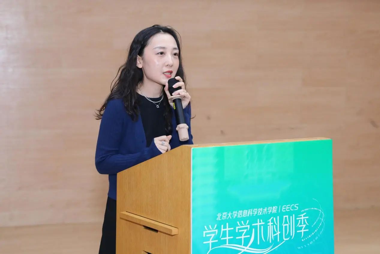 华为俞婷君在致辞中回顾了华为与北大一直以来的密切合作,从企业发展遇到的挑战和机遇出发,强调了教育、科技、人才的重要性,表达了企业一如既往助力北大信息学科高素质拔尖人才培养的愿望,并对同学们的学习科研和职业规划提出了殷切希望。