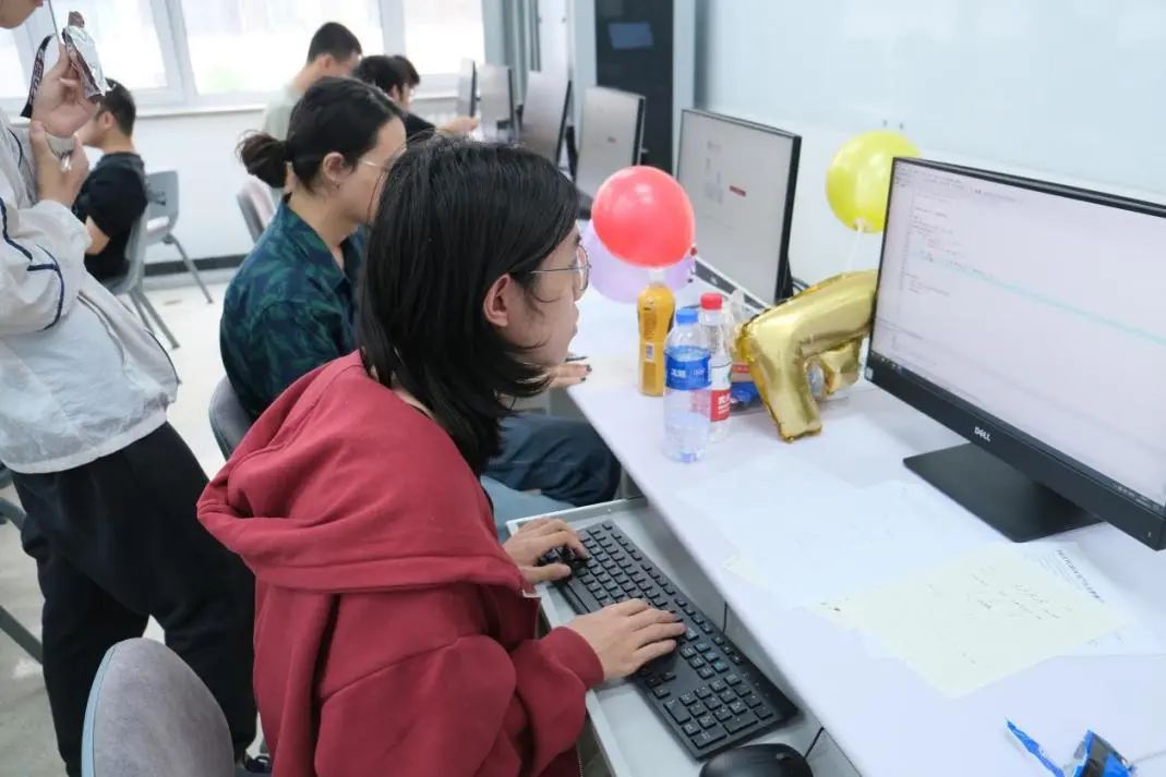 赛场上,各组选手沉浸在精妙的题目中,或小声讨论,或各自低头在纸上演算。此起彼伏的键盘敲击的声音,仿佛一个个音符,演奏着参赛队员头脑风暴的“乐章”。每完成一道题目,选手将获得一种颜色的气球,各色的气球活跃了赛场,也激励着同学们继续奋发解题。经过五个小时的角逐,最终评选了特等奖、一等奖、二等奖和三等奖,命题的一等奖、二等奖和三等奖,顽强拼搏奖,最快解题奖。
