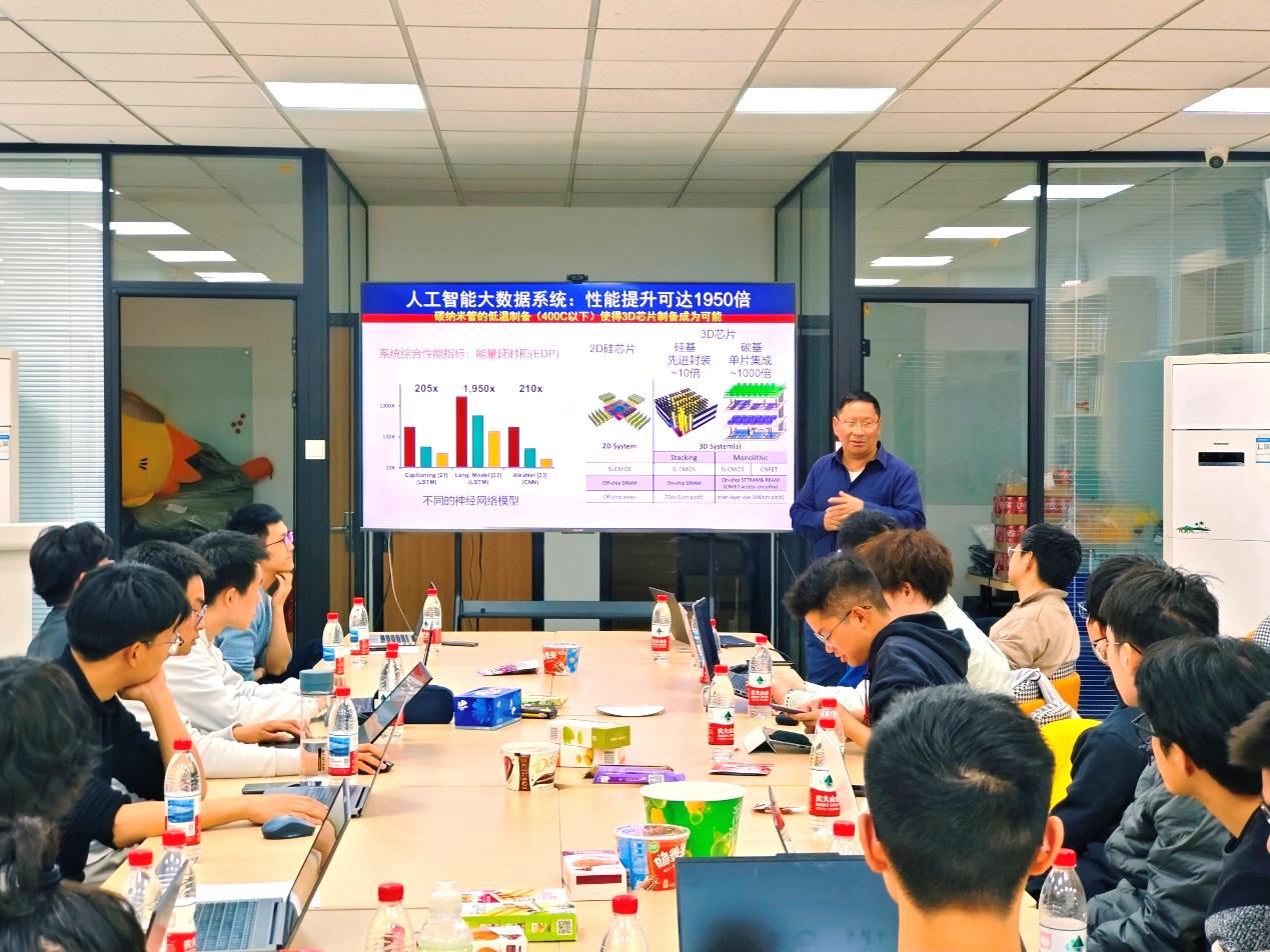 作为北京大学无线电电子学系1978级的本科生,彭练矛以学长的身份首先深情回顾了北京大学信息学科的发展历程;之后,他为大家总结了电子器件和集成电路发展过程中的重要历史节点和技术突破,分析了集成电路的发展趋势,并指出当今集成电路产业已经进入“后摩尔时代”。他认为,要想让集成电路的发展能够跟上算力需求的指数型增长,必须寻找新的材料、新的实现方式,给集成电路的性能带来质的飞跃。彭练矛给同学们简要介绍了碳纳米管的原子结构和物理性质,以及相比于传统硅材料的优势;重点讲解了北大电子学院碳基电子学研究团队在碳纳米管CMOS电路领域取得的一系列研究成果,展示了该领域光明的发展前景。