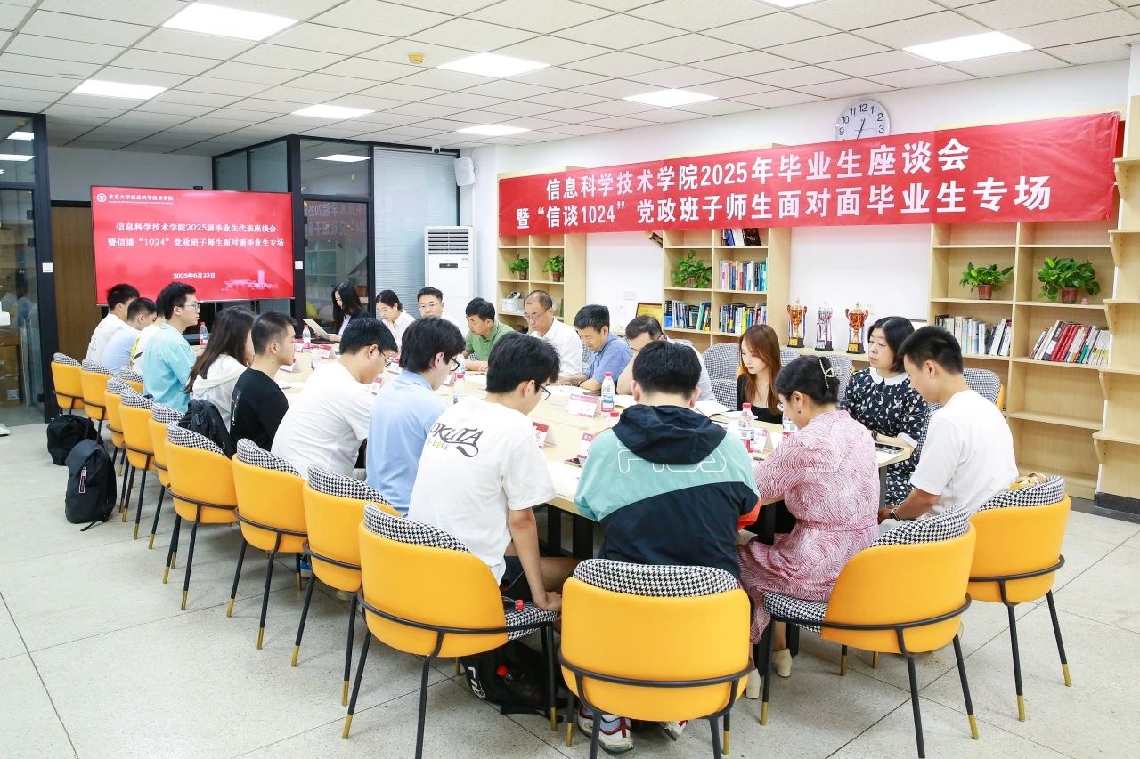 2025年6月25日中午,北京大学信息科学技术学院于理科一号楼1127会议室举办2025届毕业生代表座谈会暨“信谈1024”党政班子师生面对面毕业生专场活动。校党委副书记、学院2021级4班第二班主任姜国华,党办校办机要室主任、学院2021级4班第二班主任张璐瑶,党办校办年鉴与统计办公室主任、学院2021级6班第二班主任侯乐受邀与毕业生代表亲切交流。信科学院党委书记严敏杰、院长侯士敏、副院长陆俊林、党委副书记贾方健和教务办主任董晓晖、学工办主任李子奇等学院领导老师参会。活动由学院团委书记、毕业年级辅导员吕媛主持。