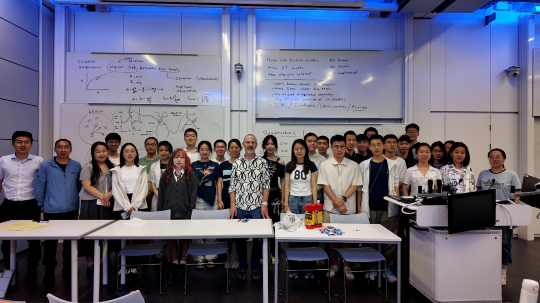 项目期间,多场高水平讲座接连登场。牛津大学理论神经科学与人工智能中心Simon Stringer博士介绍了基于脑功能计算模拟的研究,阐释了大脑视觉与空间处理机制如何启发新一代人工智能的发展,并通过案例启发学生理解 AI 商业化与产业落地的重要意义。亚马逊伦敦研发负责人殷腾飞博士系统阐述了人工智能发展现状与挑战,重点介绍其提出的FLIRT负责任AI框架,强调在保障安全与伦理的前提下推动 AI 应用落地,为学生理解可信 AI 提供了前沿视角。英国萨塞克斯大学电信与人工智能教授Maziar Nekovee结合其在三星与英国电信的产业经验,深入讲解AI在5G/6G通信网络、能源可持续发展及自动驾驶中的应用,强调AI技术与产业深度融合对未来社会的战略意义。牛津大学互联网研究所副教授Bernie Hogan以“自编码困境”为题,探讨了机器学习中编码与自编码的差异,强调信号理解不仅是传输,更涉及推断与主体性,对人工智能信任与治理具有深远启示。伦敦大学学院盖茨比研究中心Peter Latham博士深入分析“AI与脑科学的交叉融合”,探讨AI发展未来的潜力和方向。
