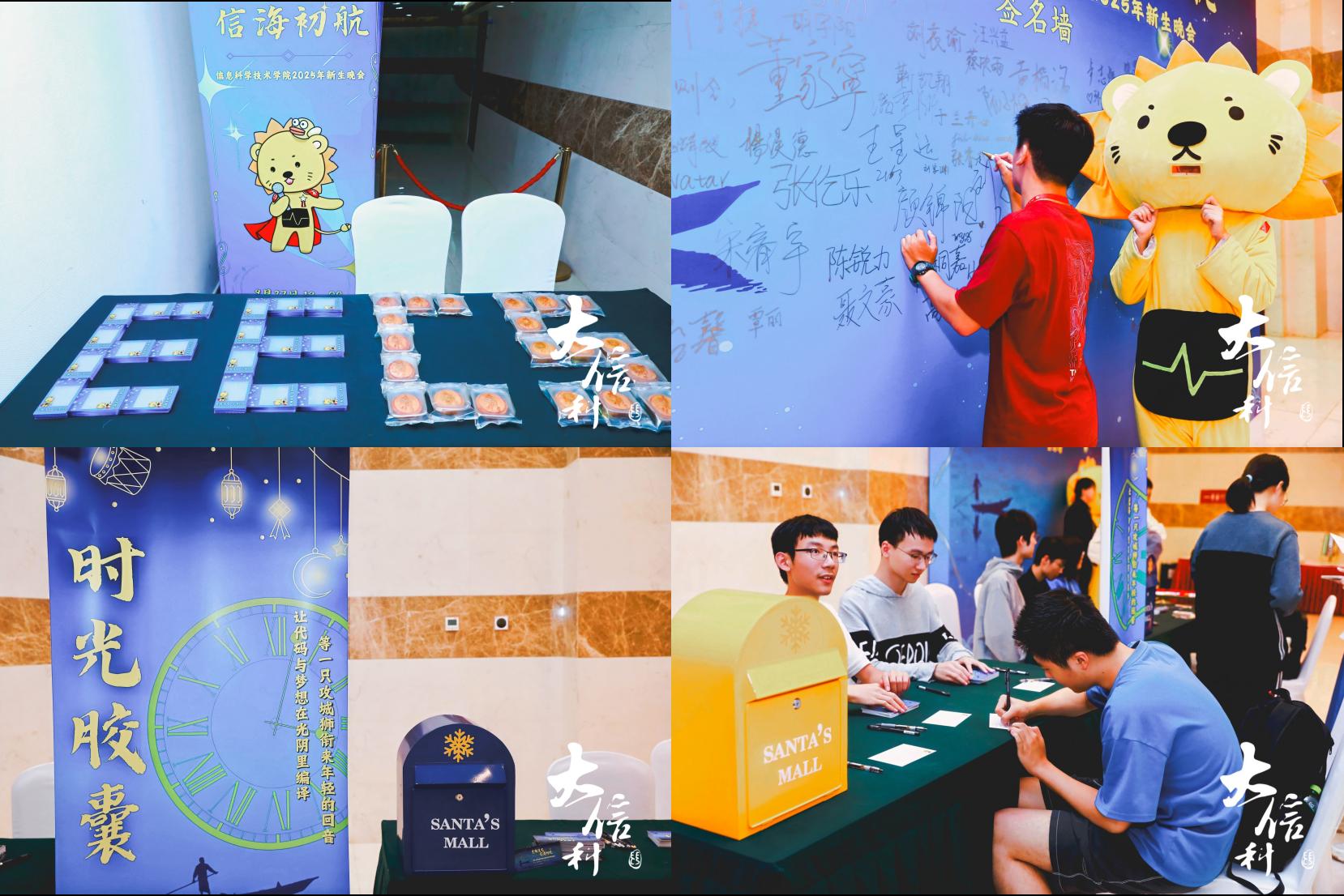 在晚会开始前,学院精心准备了“大信科”定制月饼、特色透卡,同步开展“时光胶囊”预热活动,让新生写下对未来四年的期许,并设置签名墙供师生打卡留念,让新生在满满仪式感中开启大学新旅程。