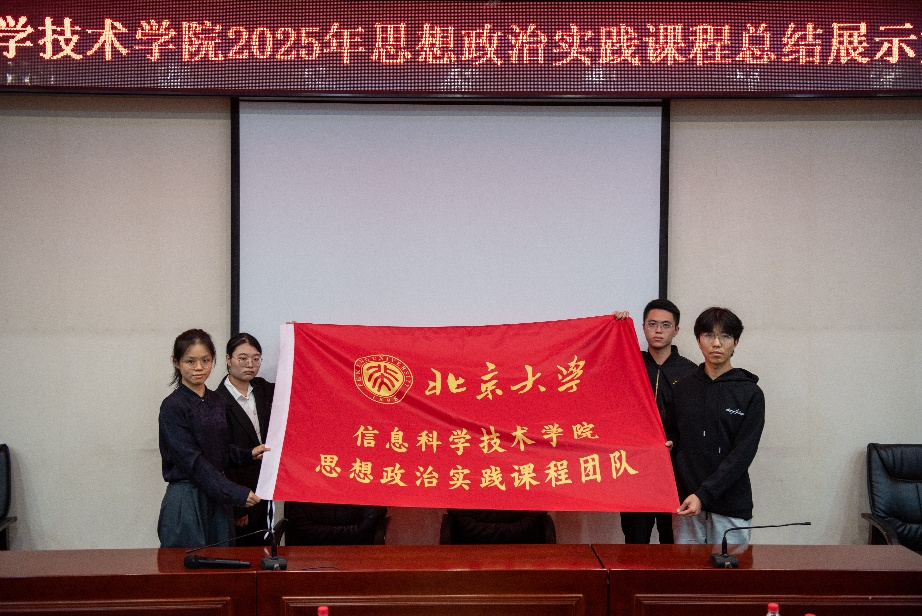 在大会的高潮环节,举行了庄严的思政实践课程团队旗帜传递仪式。2024级学生代表将象征着责任与传承的实践团团旗郑重交到2025级新生代表手中。旗帜的传递,不仅是任务的交接,更是精神的延续。它承载着信科青年"知行合一、服务国家"的优良传统,寄托着学院对新生力量再接再厉、再创佳绩的殷切期望。全场掌声雷动,预示着思政实践课程将在新一级信科青年手中继续焕发勃勃生机。