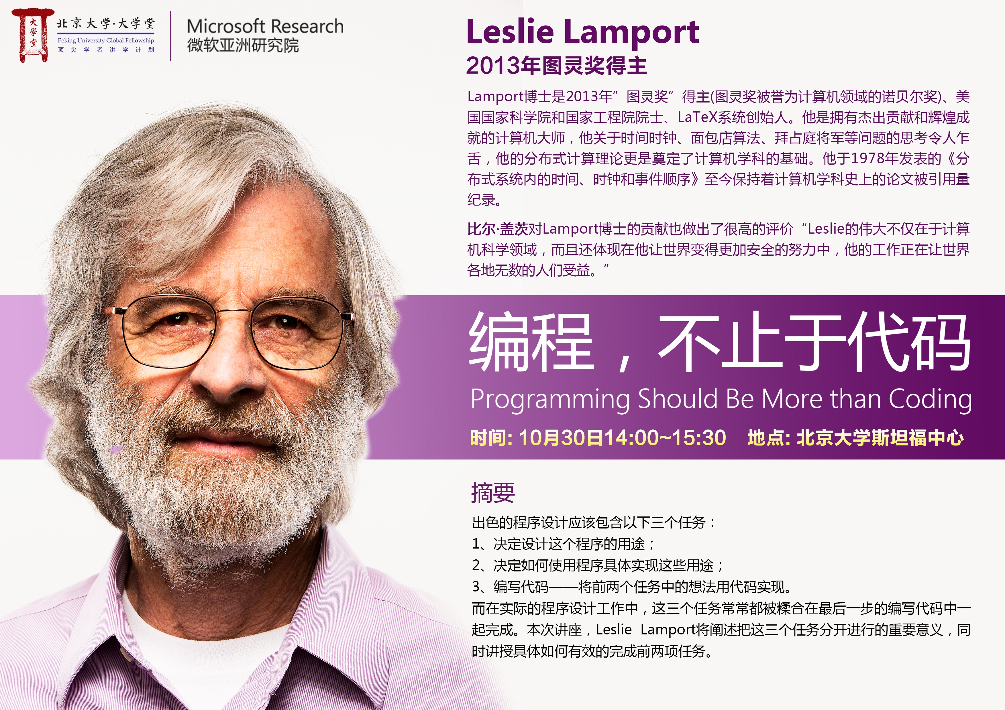 北京大学“大学堂”顶尖学者讲学计划之2013图灵奖获得者Leslie Lamport博士在未名湖畔跟你聊聊编程那些事儿