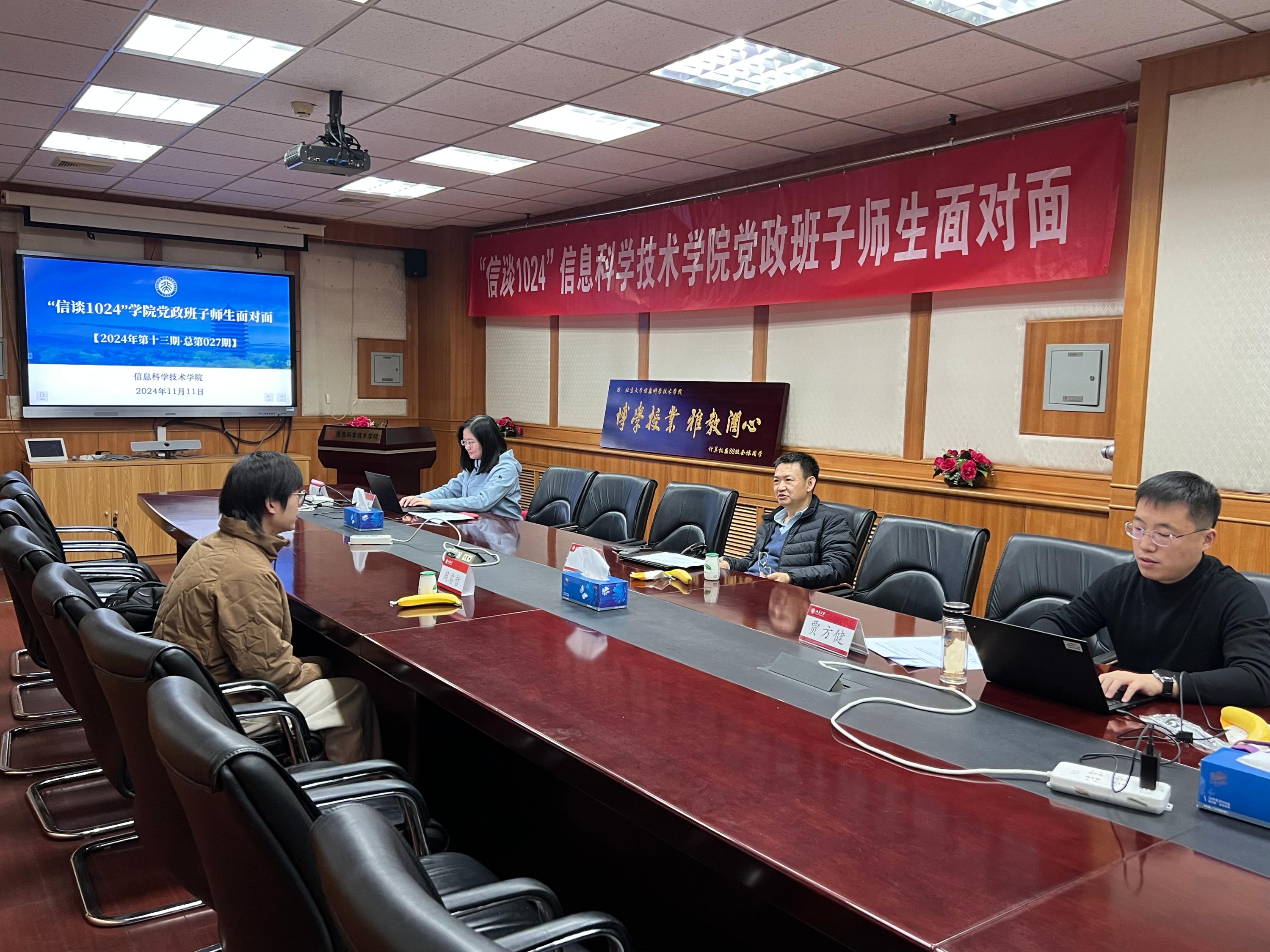 2024年11月11日中午,信息科学技术学院在理科二号楼2111会议室举办2024年第十三期(总第27期)“信谈1024”学院党政班子师生面对面之深造和就业专题活动,本次座谈会采取个人单独面谈的形式,对报名同学们的问题依次答疑解惑。院长侯士敏、党委副书记贾方健,成功报名的学生们参加了本次面谈。活动由学院学工办主任李子奇主持。
