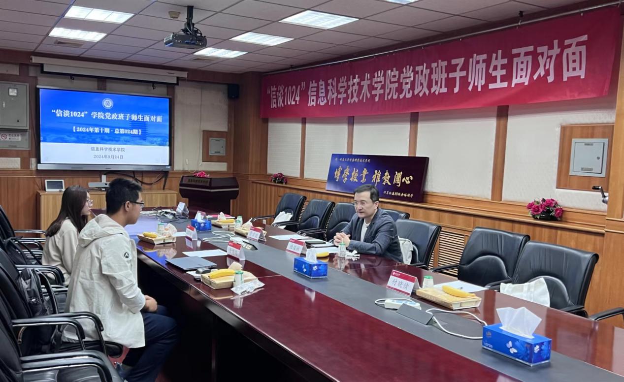 2024年9月24日中午,信息科学技术学院在理科二号楼2111会议室举办2024年第十期(总第24期)“信谈1024”学院党政班子师生面对面座谈会,本次座谈会采取多人群体座谈的形式,对报名同学的问题进行全面答疑解惑。院长侯士敏、副院长陆俊林,成功报名的学生代表参加了本次面谈。活动由学院学工办干部付晓倩主持。