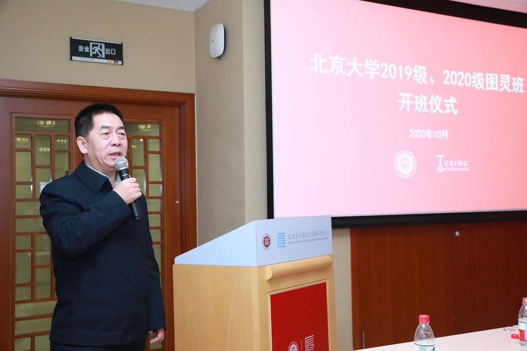 刘建波代表教务部对2019级、2020级图灵班开班表示祝贺,并对霍普克罗夫特教授,以及信息学院的领导和老师们为该计划倾注的心血表达感谢。他希望同学们在北大的学习期间保持自信,团结协作,期待从图灵班走出北京大学信息科学的“黄金一代”。