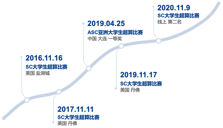 北京大学超算队组建自2016年春天,并在2017年获得了教务部本科教学改革项目的支持。在第一次队员招募之后,随即入围了SC16大学生超算比赛的决赛。第一次参加比赛,获得了第六名的成绩,也为之后的比赛准备、人员培养打下了很好的基础。之后,超算队又陆续参加了SC17、SC19、ASC19大学生超算比赛。