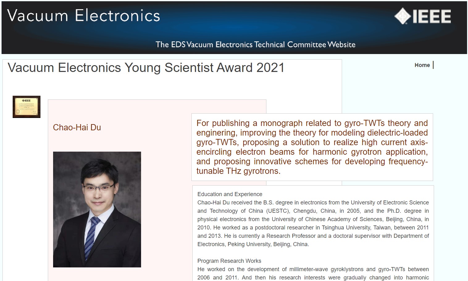 获奖信息官网链接:https://vacuumelectronics.org/ivec_award/chao-hai_du.html