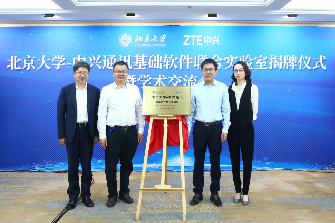 2021年5月20日,“北京大学-中兴通讯基础软件联合实验室揭牌仪式暨学术交流会”在北京大学英杰交流中心召开。中兴通讯执行副总裁、CTO王喜瑜,首席发展官崔丽,公共事务部主任林晓东,中心研究院院长黄力青、副院长屠要峰,国家重点实验室运营总监牟林,操作系统产品部部长薛志宏,首席规划专家王建利,计算存储技术委员会主任熊先奎,人工智能技术委员会主任韩炳涛,操作系统技术专家程圣宇;北京大学副校长张平文,北京大学科技开发部部长姚卫浩,副部长邱建国,北京大学信息科学技术学院党委书记魏中鹏,副院长兼计算机科学技术系主任胡振江,副系主任崔斌、郭耀,高可信软件技术教育部重点实验室副主任张路、谢涛,高能效应用与计算中心执行主任罗国杰,联合实验室综合管理办公室主任熊英飞等领导和专家出席。张平文、王喜瑜分别致辞,崔斌主持。