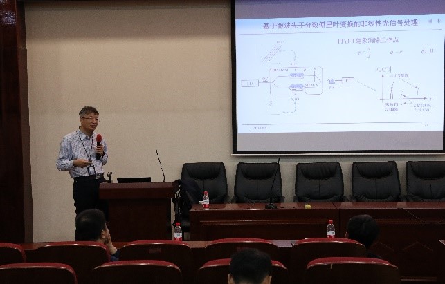 然后,郑小平教授从波形的产生、波形的接收、时频同步网、目标速度的测量、波束的扫描等方面具体阐述了微波光子雷达核心器件的原理与性能。在波形的产生方面,需要既能产生宽带正交波形、宽带线性调频波,又能够在这两种波形之间进行快速地切换,即波形捷变,而波形接收过程中的难点在于消除光学差拍带来的鬼象信号。郑小平教授介绍了一种鬼象消除的新思想,利用分数域光学非线性信号处理理论与方法,能够有效消除鬼象的频域信号。关于时频同步网,郑小平教授指出,核心的工作在于用光学的方式实现了微波的相位共轭,为光纤环网的实现奠定了基础。在目标速度测量方面,微波光子雷达在测量多个目标时,存在虚假测量。郑小平教授详细解释了虚假目标出现的原因,解决的思路以及利用该方法消除虚假目标的效果。关于波束的扫描,郑小平教授介绍了波束扫描的原理以及光控波束成形网络的基本结构。