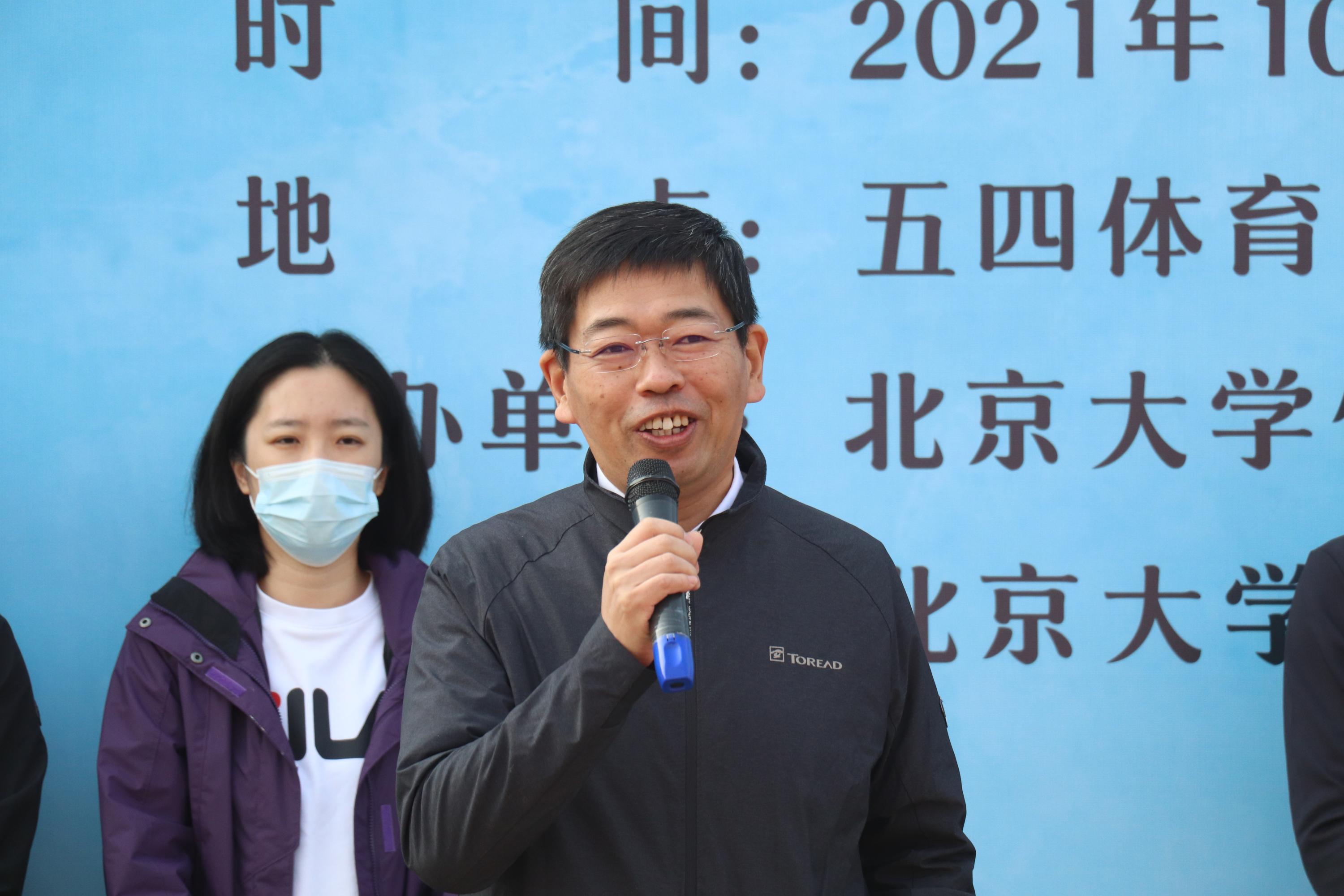 在运动员方阵入场后,趣味运动会开幕式正式开始。首先北京大学体育教研部主任钱俊伟老师为本次活动致辞。钱俊伟老师表示,要坚持“健康第一”的思想,希望通过本次运动会来培养同学们勇于挑战、敢于竞争的精神,让大家爱上运动、享受运动,通过运动建立积极自信的人生态度。