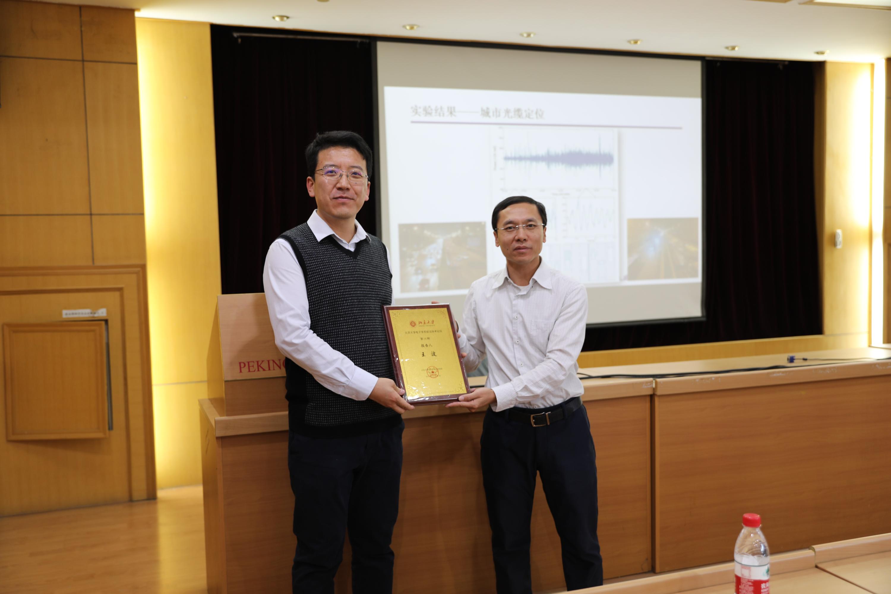 本期论坛最后,电子学系副系主任王延辉为王波副教授颁发了本次活动的纪念证书并合影留念。本期讲座在愉快的氛围中圆满结束。