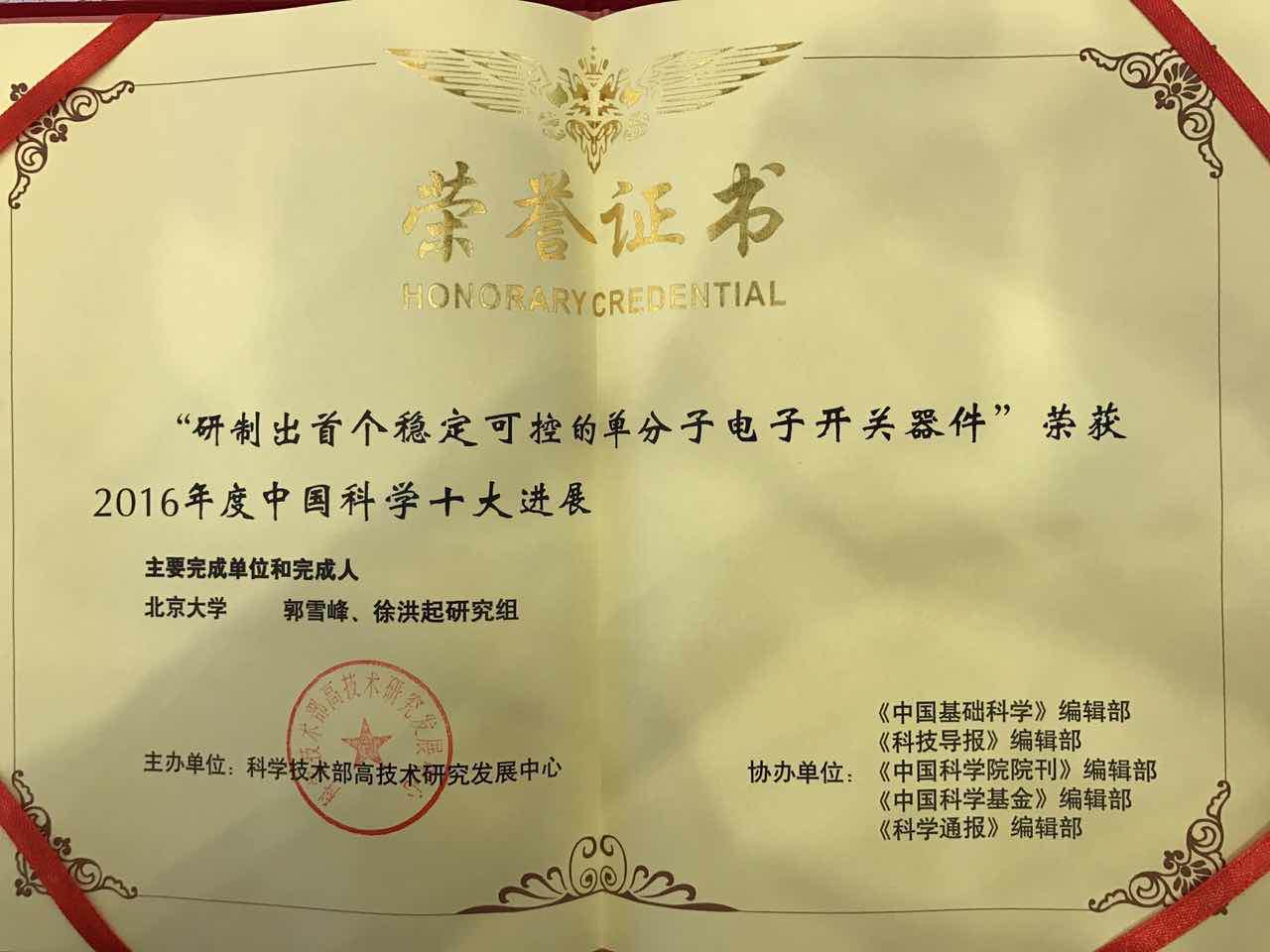 其中,世界上首个真实、稳定可控的单分子电子开关器件的研制工作由北京大学化学与分子工程学院、北京分子科学国家实验室郭雪峰教授,信息科学技术学院物理电子学研究所、纳米器件物理与化学教育部重点实验室徐洪起教授联合课题组完成。课题组原创性地发展了以石墨烯为电极、通过共价键连接来稳定单分子器件的关键制备方法,突破性地构建了一类全可逆的光诱导和电场诱导的双模式单分子光电子开关器件。这种单分子电子器件在未来高度集成的信息处理器、分子计算机和精准分子诊断技术等方面具有巨大的应用前景。