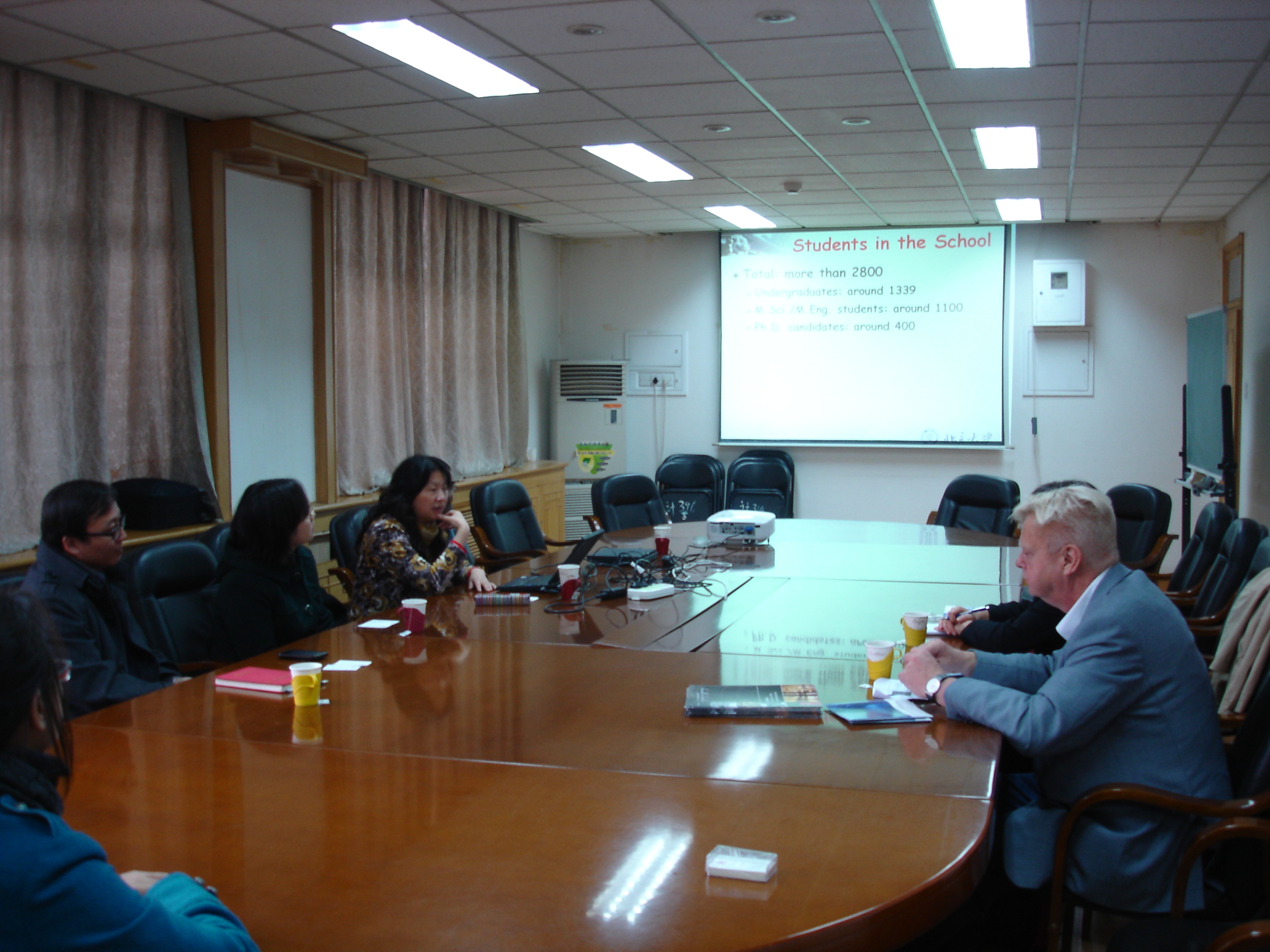 学院副院长李文新教授主持见面交流会,并首先向瑞典同行介绍了学院的历史和发展现状。Anders Berglund、Louise Rugheimer博士也分别对信息技术系和MedfarmDoIT中心的教学方法做了简单介绍,并播放了介绍乌普萨拉大学的中文短片。随后,李文新副院长、计算机科学技术系副主任陈一峯研究员,以及目前讲授本科生必修课的李戈副教授(软件研究所)、陈江副教授(现代通信研究所)、胡俊峰副教授(计算语言学研究所)、蒋婷婷博士(数字媒体研究所)与客人分享了各自的教学体会与心得。此外,双方着重讨论了学生交换、教师互访、远程教学等交流方式的实施细节。