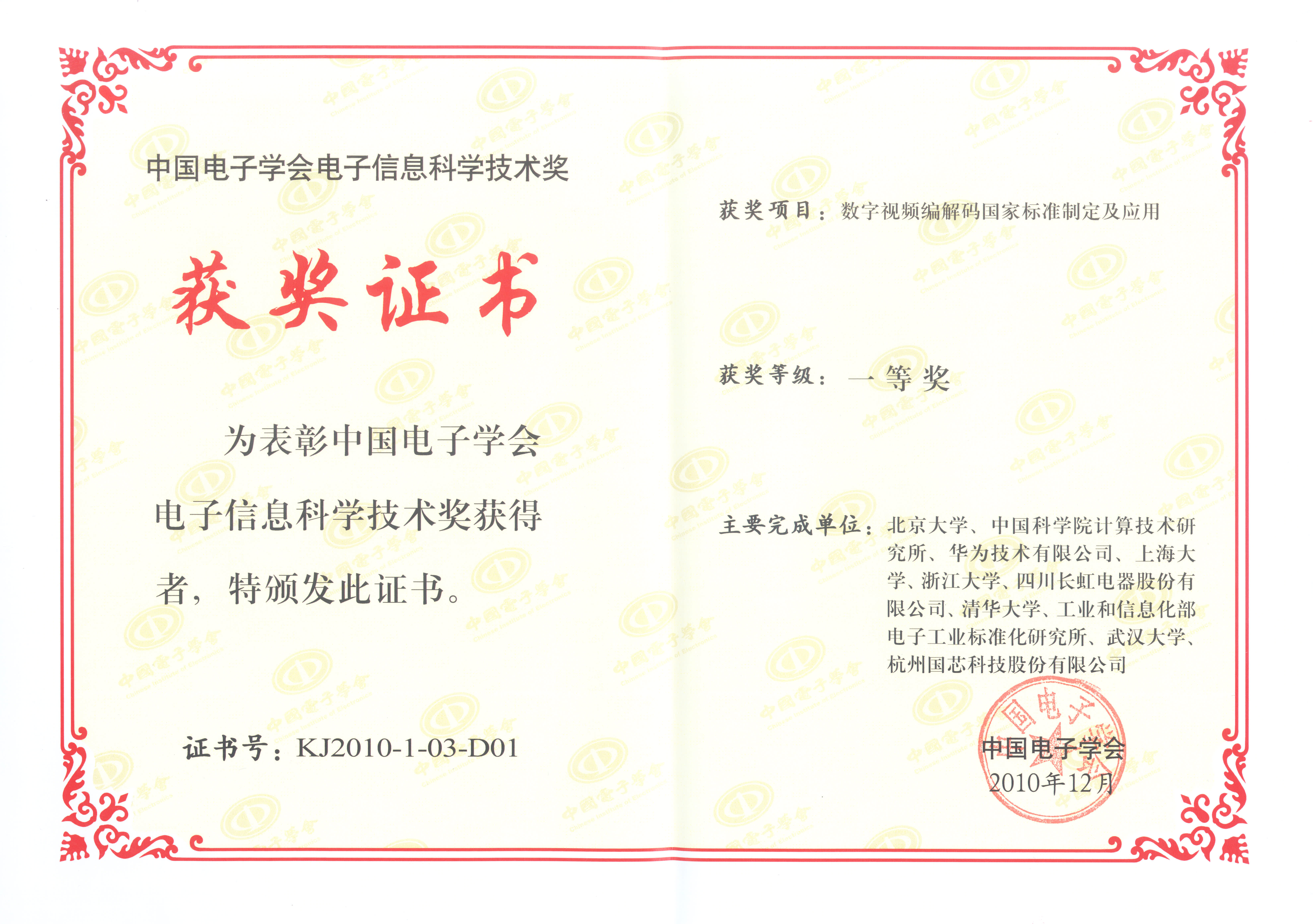 “数字视频编解码国家标准制定及应用” 荣获中国电子学会电子信息科学技术一等奖