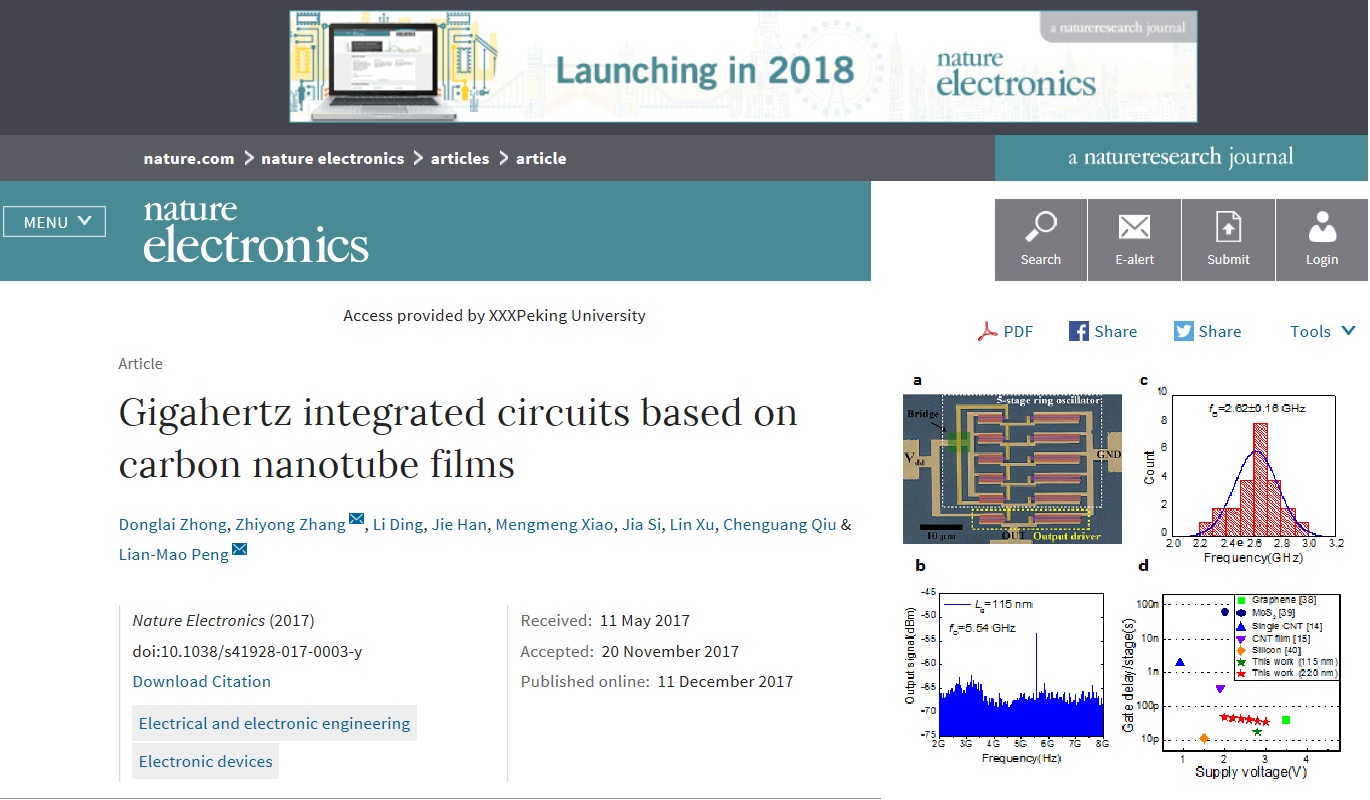 物理电子学研究所彭练矛-张志勇团队实现世界上首个千兆赫兹碳纳米管集成电路